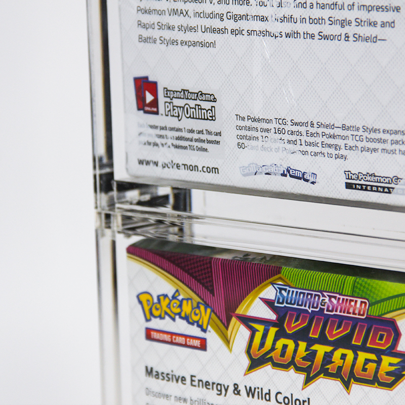 Realizzata in acrilico di alta qualità e antigraffio, questa protezione impilabile offre una lunga durata per proteggere le scatole booster da polvere, graffi e piccoli urti; il suo design trasparente preserva la piena visibilità della grafica della scatola mantenendone intatto il contenuto, e la struttura impilabile massimizza l'efficienza di stoccaggio, consentendo agli utenti di creare un'esposizione ordinata e visivamente accattivante di più scatole. A differenza delle fragili alternative in plastica, mantiene la stabilità strutturale anche quando impilata, combinando una protezione pratica con una presentazione elegante e professionale.
