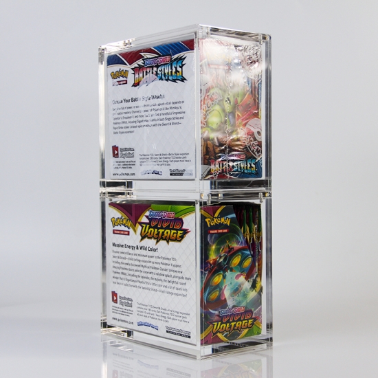Realizzata in materiale acrilico trasparente e resistente, ogni custodia racchiude in modo sicuro una singola scatola booster, mettendo in mostra la sua grafica originale attraverso i pannelli trasparenti; più unità possono essere impilate verticalmente per organizzare ed esporre le collezioni senza occupare spazio in eccesso, il che la rende ideale per collezionisti, rivenditori o appassionati di TCG che desiderano proteggere ed esporre i loro set di scatole booster.