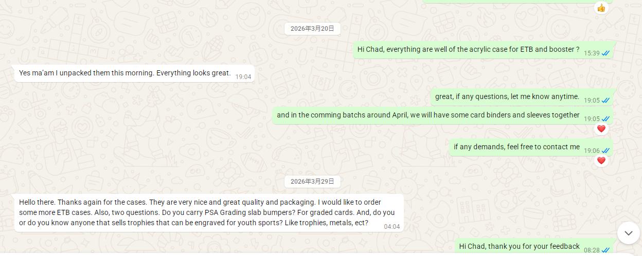 YAGELI è ampiamente riconosciuta come uno dei principali produttori di accessori per carte collezionabili in Cina. L'azienda vanta oltre 27 anni di esperienza, uno stabilimento di produzione di 293.750 piedi quadrati, più di 500 operai specializzati ed esporta in oltre 88 paesi. Si concentra su porta carte premium, porta carte rigidi, custodie per carte graduate, raccoglitori, bustine, custodie magnetiche e espositori in acrilico per carte, offrendo servizi OEM e ODM completi per marchi globali.